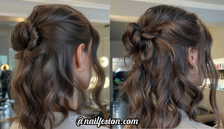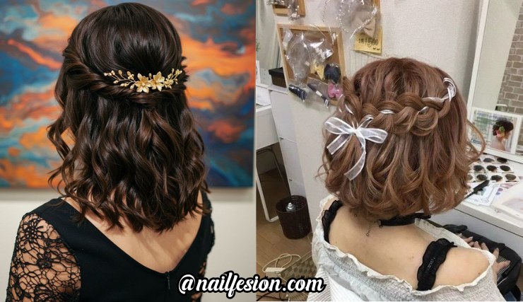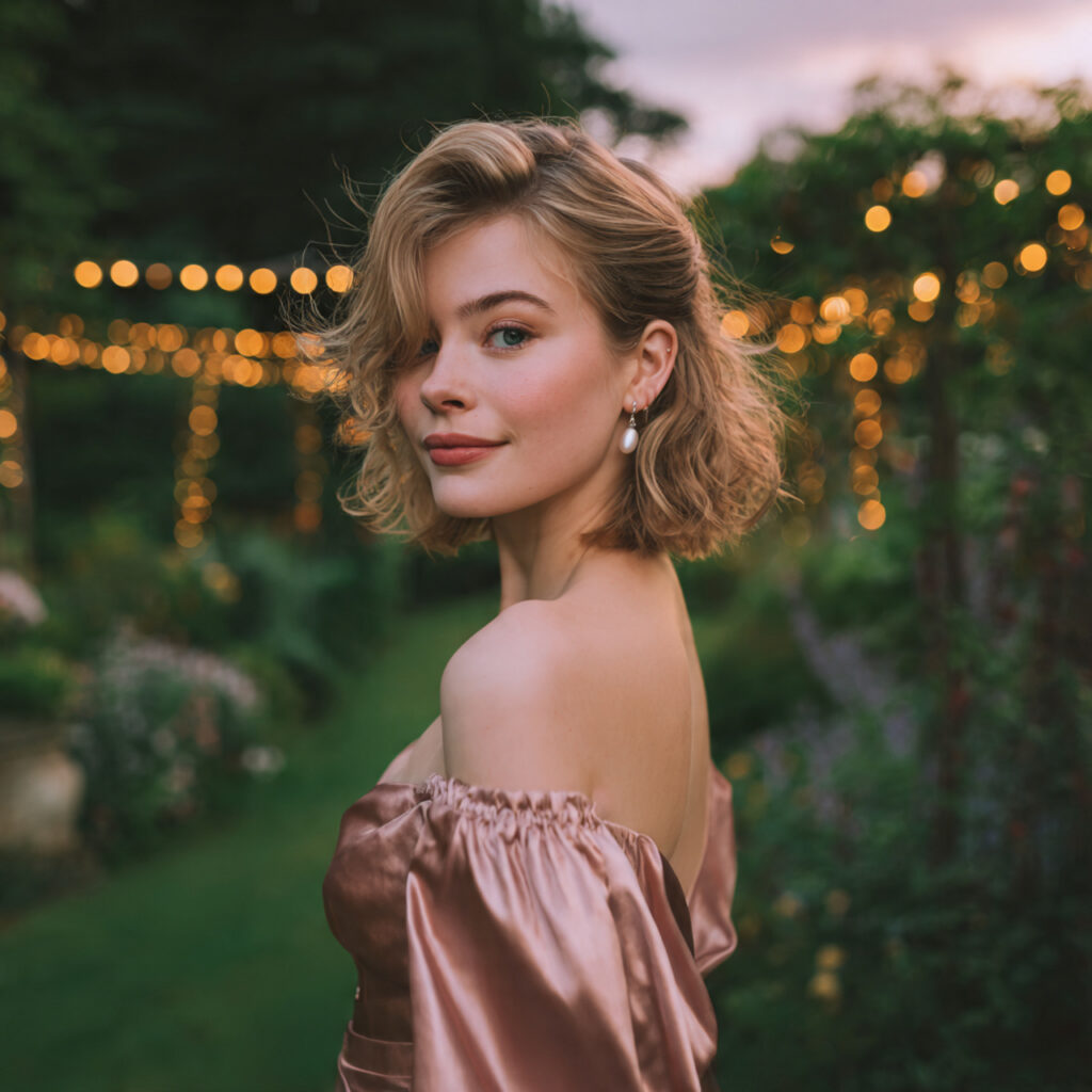This soft, romantic curls look lifts the top half into gentle twists while leaving the rest in loose waves. It’s perfect for flowy dresses and soft makeup. It makes short hair feel dreamy and elegant — ideal for slow dances under the lights and photos with friends.