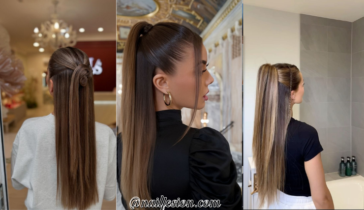This sleek straight style is perfect if you want a clean and polished look. In this half up half down hairstyles for long hairs idea, tum straighten your hair fully and pull the top section back tightly. It gives a smooth, shiny finish that looks super modern and chic. This hairstyle is perfect for formal events, office looks, or classy outings. It’s trending because minimal and sleek styles are dominating Pinterest right now. You can wrap a strand around the hair tie for a cleaner finish. It’s simple yet powerful, making your overall look feel more put-together instantly.