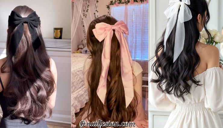 Adding a ribbon makes your hairstyle instantly Pinterest-worthy. In this half up half down hairstyles for long hairs look, tum tie the top section and secure it with a soft ribbon bow. The rest of your hair can be straight or wavy depending on your mood. This style is perfect for dates, brunch, or cute aesthetic photos. It’s trending because bows and ribbons are making a big comeback. Choose neutral or pastel colors for a soft vibe. It’s a simple detail, but it transforms your entire look into something more stylish and eye-catching.