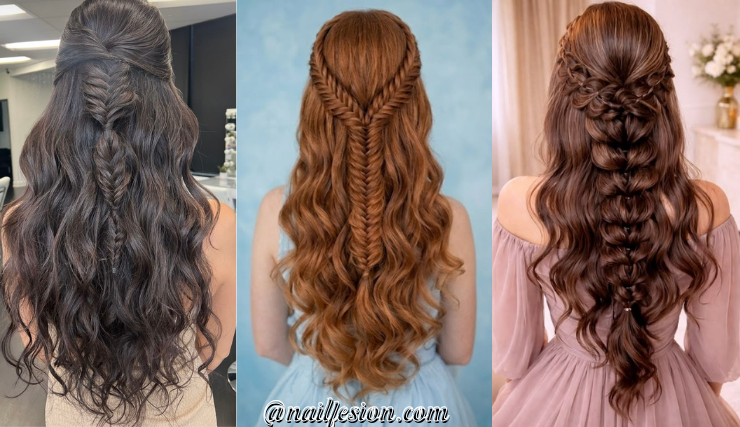 This fishtail braid style is perfect if you want something detailed and unique. In this half up half down hairstyles for long hairs look, tum create a fishtail braid using the top section while leaving the rest loose. It adds texture and looks super intricate even if it’s simple to do. This hairstyle is perfect for festivals, weddings, or special occasions. It’s trending because braided styles always stand out on Pinterest. Pull the braid slightly to make it look fuller. This adds volume and gives your hairstyle a more relaxed and trendy finish.