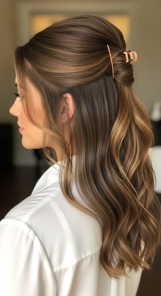 Loose beachy curls with sparkling jewel clips create a fun and glamorous vibe. Ideal for prom nights, casual weddings, or summer parties, the soft waves and clips add movement and shine. Pairs beautifully with flowy or off-shoulder dresses.