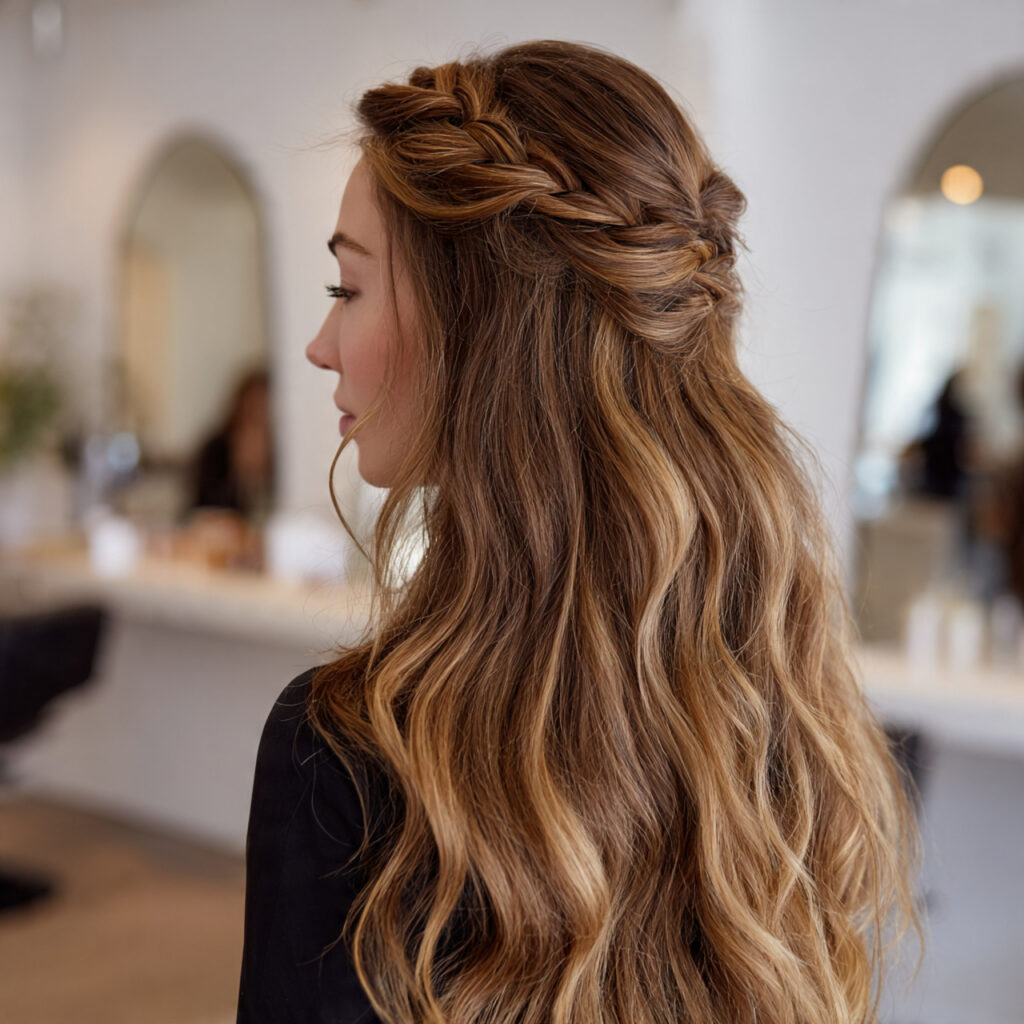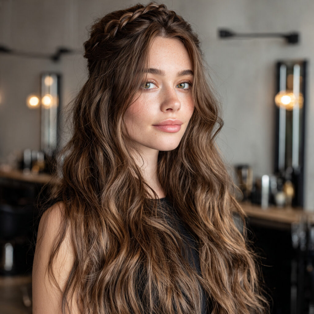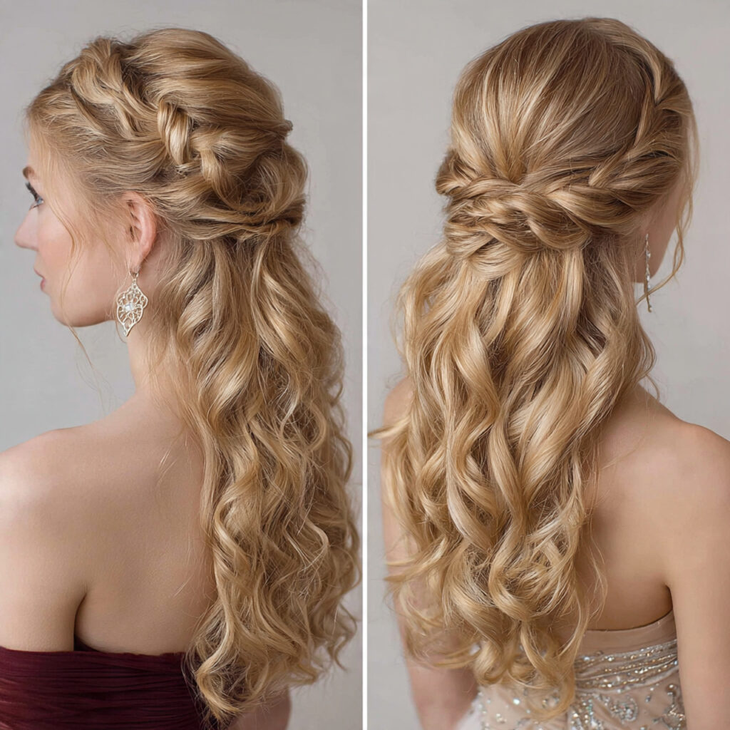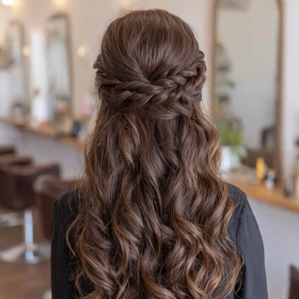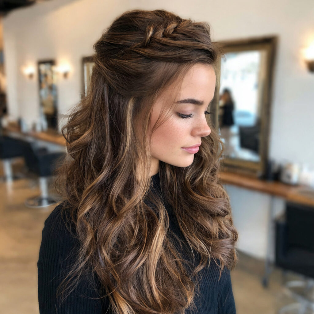 A braided crown half-up half-down style exudes a regal and romantic charm. Great for weddings, proms, or photoshoots, this hairstyle keeps hair off the face while letting curls flow freely. Complements floral or boho dresses perfectly.
