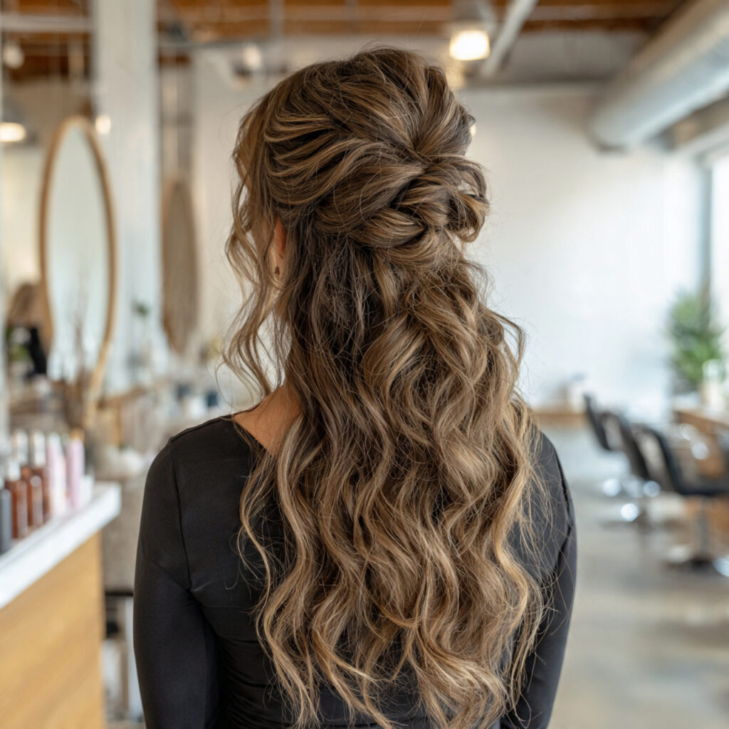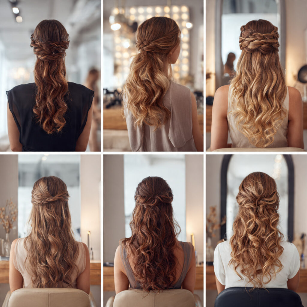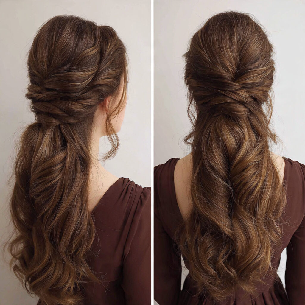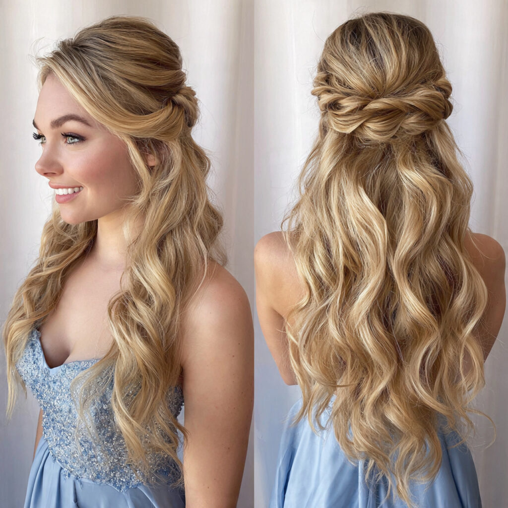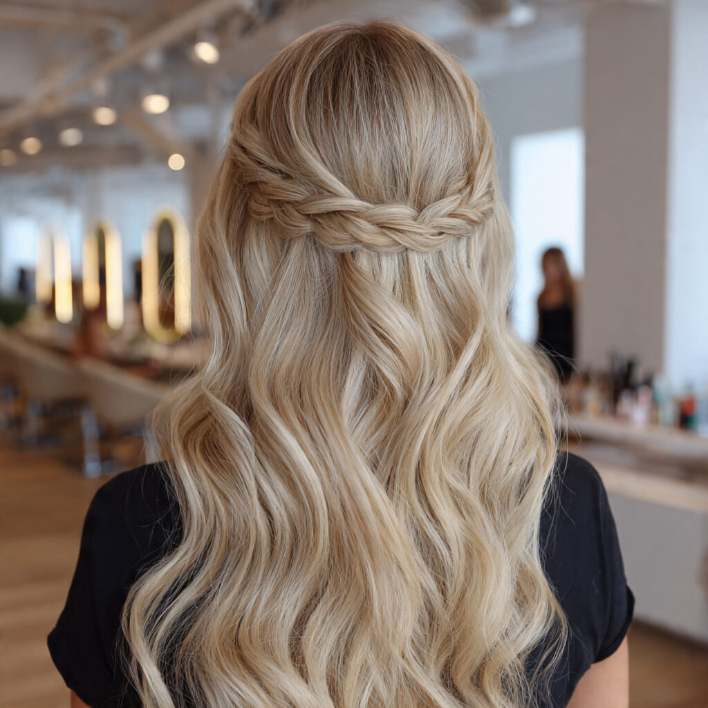 A braided crown half-up half-down style exudes a regal and romantic charm. Great for weddings, proms, or photoshoots, this hairstyle keeps hair off the face while letting curls flow freely. Complements floral or boho dresses perfectly.