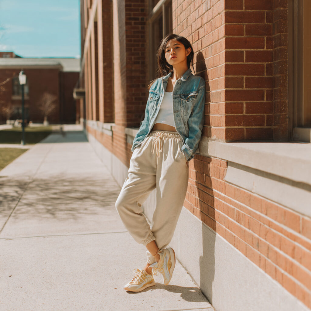 Elevate your school style by layering a cool denim jacket over a fitted tee and neutral sweatpants. This Pinterest‑favored outfit feels classic yet relaxed, perfect for unpredictable weather and easy to accessorize with colorful socks or canvas shoes. Great for everyday classes or a casual hangout after school — this look’s timeless appeal keeps saving it again and again.
