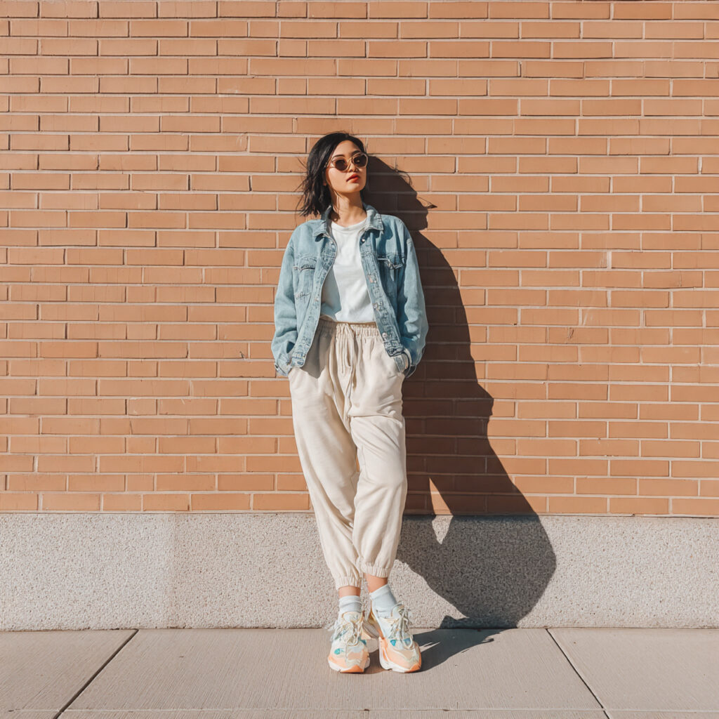 3. Denim Jacket Over Neutral Sweatpants Outfit