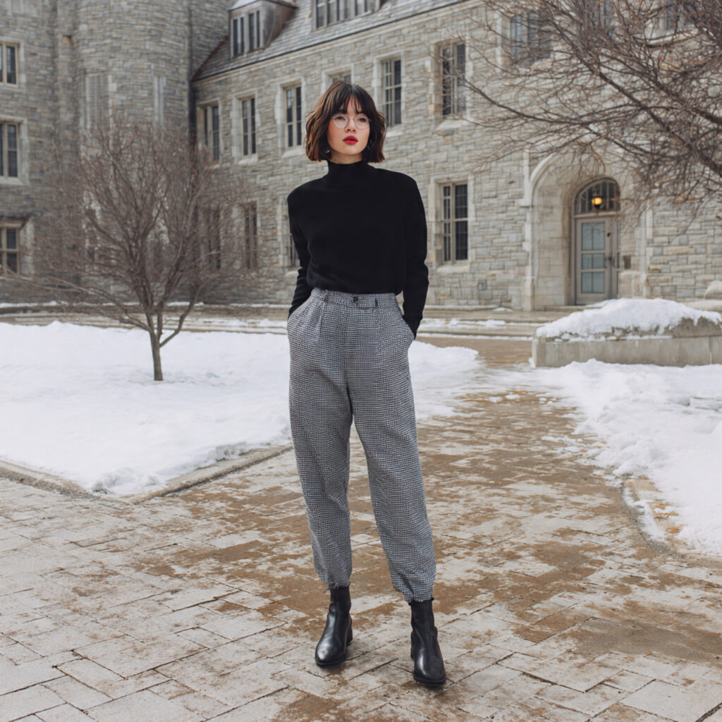 Stay warm and fashionable by pairing a fitted turtleneck with sleek sweatpants and boots. This chic outfit idea for school sweatpants is perfect for colder days and looks incredibly stylish on Pinterest boards. Add a beanie or simple belt to refine the look. It’s cozy but elevated — a trending school outfit for cooler seasons.