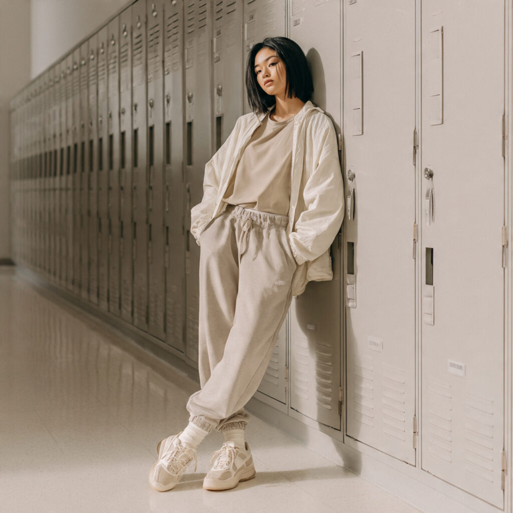 Take a minimalist route with a monochrome outfit — matching neutral sweatpants with a similarly toned tee and light jacket. This calm, cohesive look is trending for school style boards because it feels polished without trying too hard. Add simple gold jewelry and sleek sneakers for a chic everyday outfit that feels mature but still teen‑friendly.