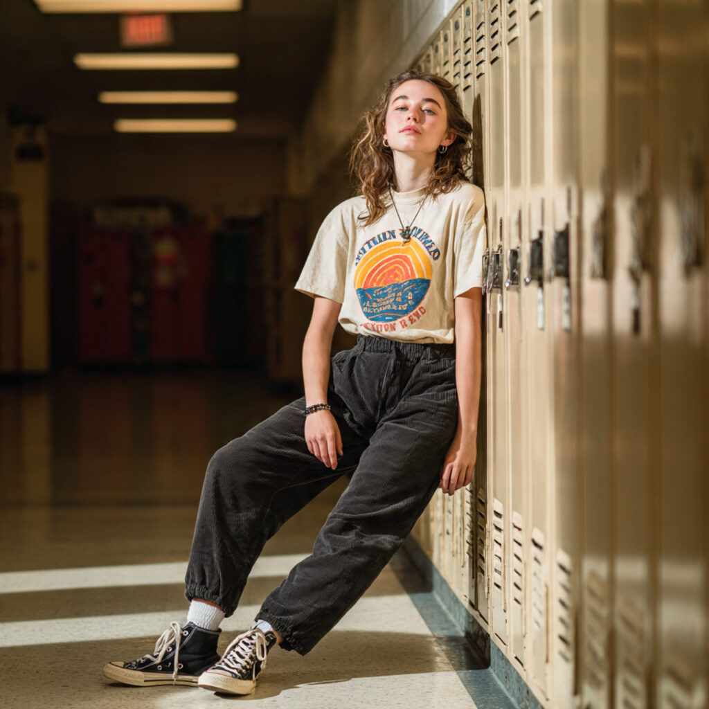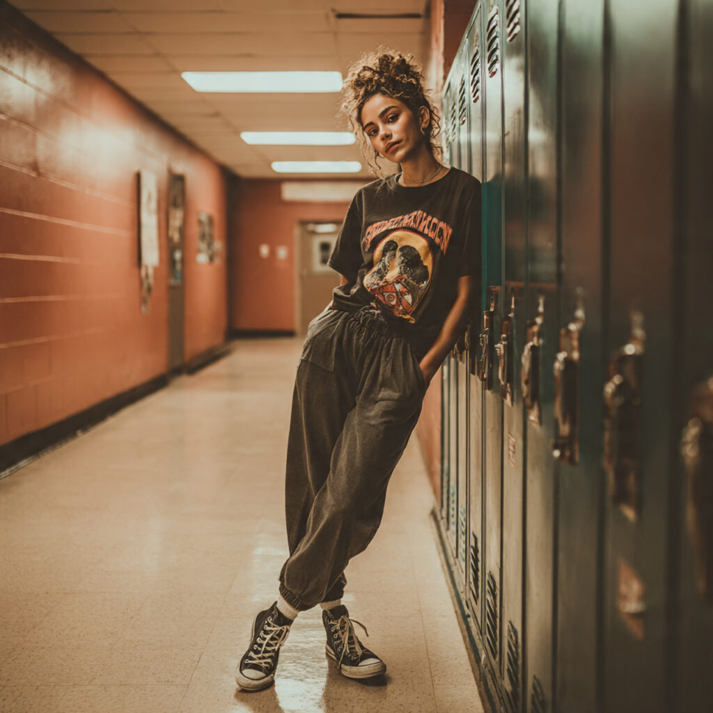 Go retro with a vintage band tee and cuffed sweatpants look. This stylish combo mixes old‑school cool with laid‑back comfort — perfect for creative teens who love music and fashion. Complete the vibe with high‑top sneakers and a casual backpack. Pinterest trends show this nostalgic outfit idea is being saved over and over.