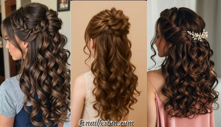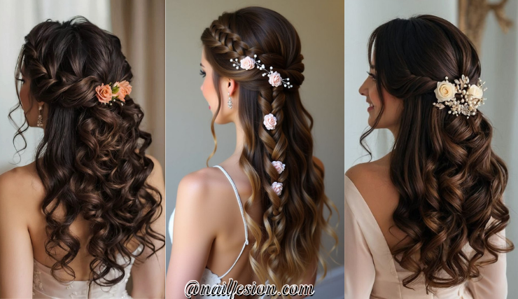 Turn your look up a notch with a half up half down braid with accessories. Add tiny clips, pearls, or ribbons inside your braid to make it pop. This gives a stylish, Pinterest‑inspired finish that looks especially cute for weddings, festive events, or outfit photos. It’s also perfect if tum love customizing your look and showing off your personal style. This trend is everywhere because little accents transform braids from pretty to unforgettable.