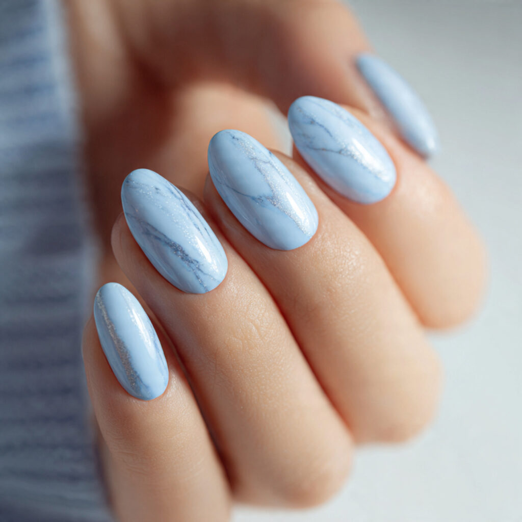 Pastel blue base with white marble veins and silver glitter accents creates a delicate yet luxurious effect.