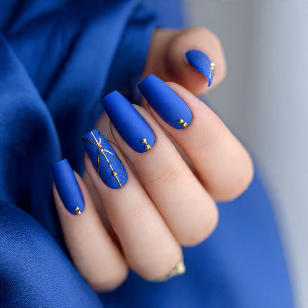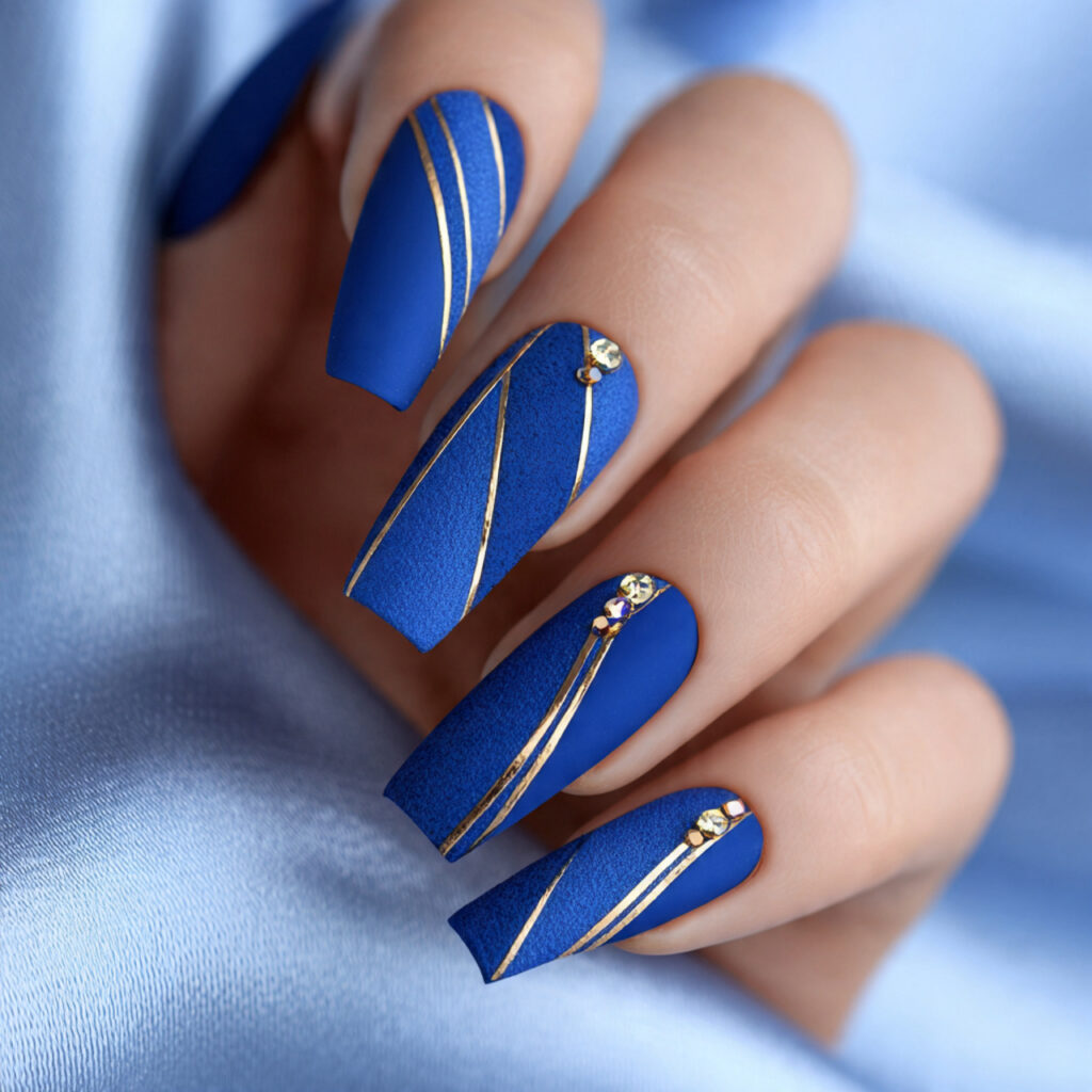 Cobalt blue contrasted with gold lines creates a bold, eye-catching effect. Matte and glossy finishes interplay for depth and dimension.