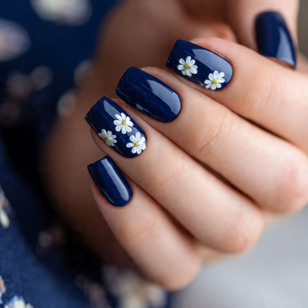 Deep navy provides a strong base, while tiny white daisies offer a delicate, cheerful contrast.