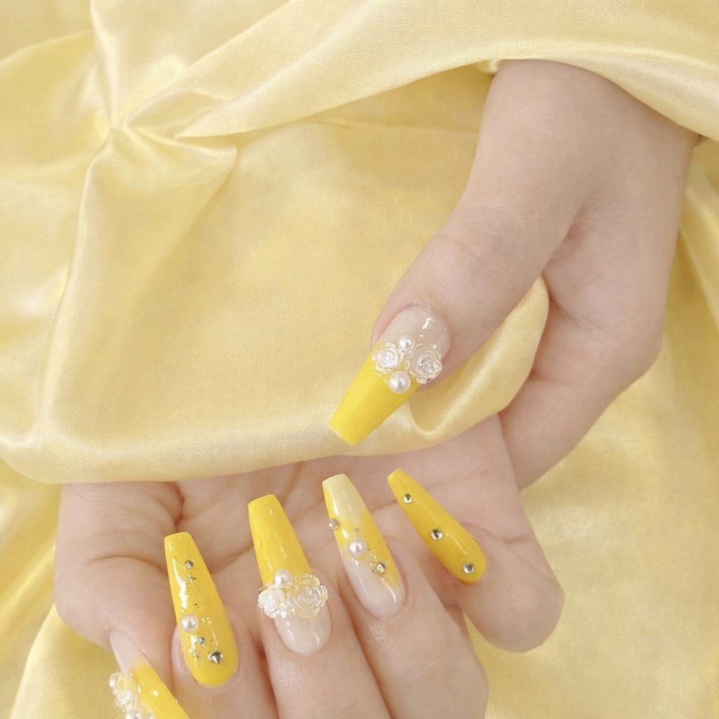 Inspired by sunny summer mornings and gentle flower fields, this design blends happiness with elegance. Tiny daisies add a sweet, playful touch to a soft yellow base, making it ideal for those who love subtle yet cheerful manicures.