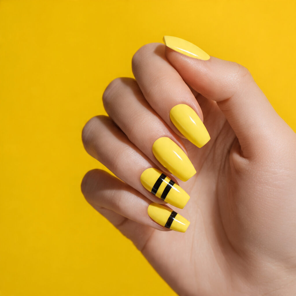 This design combines summer energy with a modern edge. The bold yellow exudes confidence, while geometric black stripes create a contemporary, artistic vibe. Ideal for trendsetters who love graphic nail art.