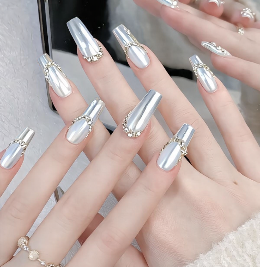 This design is perfect for anyone who loves chic, reflective nails without over-the-top decoration. It boosts confidence, looks polished for special events, and adds a touch of glamour to everyday life. White chrome nails are ideal for stylish women who enjoy self-care and minimalistic beauty.