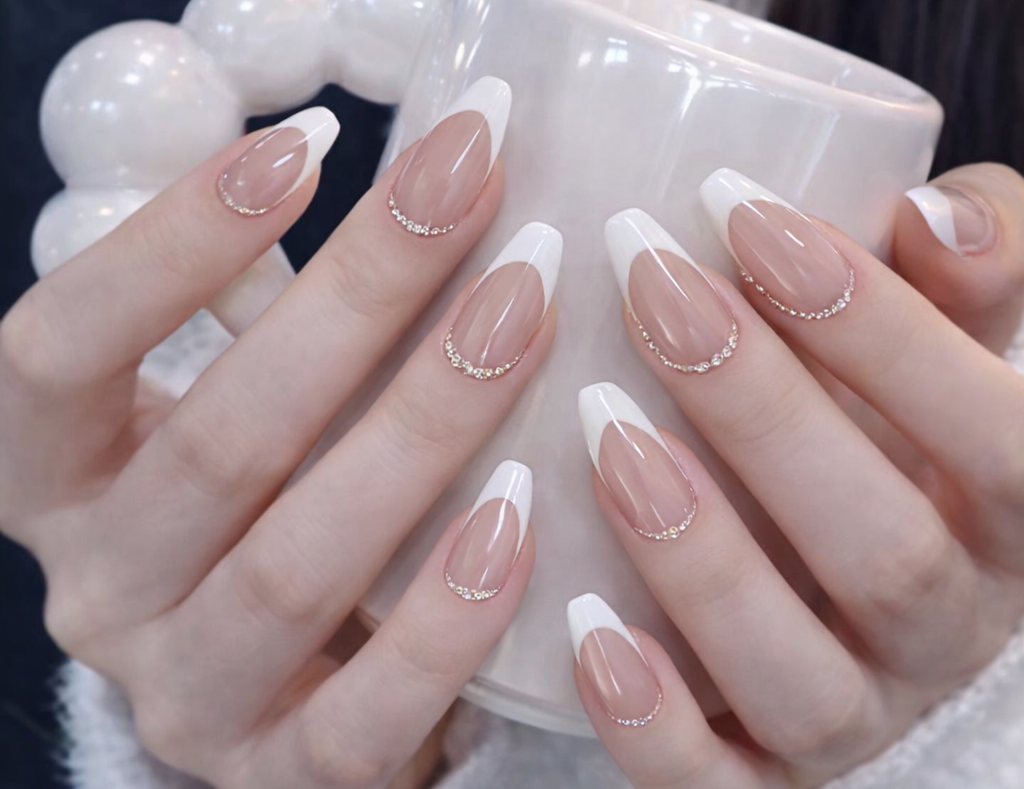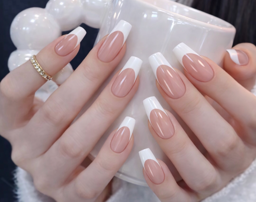 With regular polish, white French nails usually last 4–7 days. Gel or acrylic versions can last up to 2–3 weeks. Proper prep, sealed edges, and gentle daily activities help maintain the look longer.